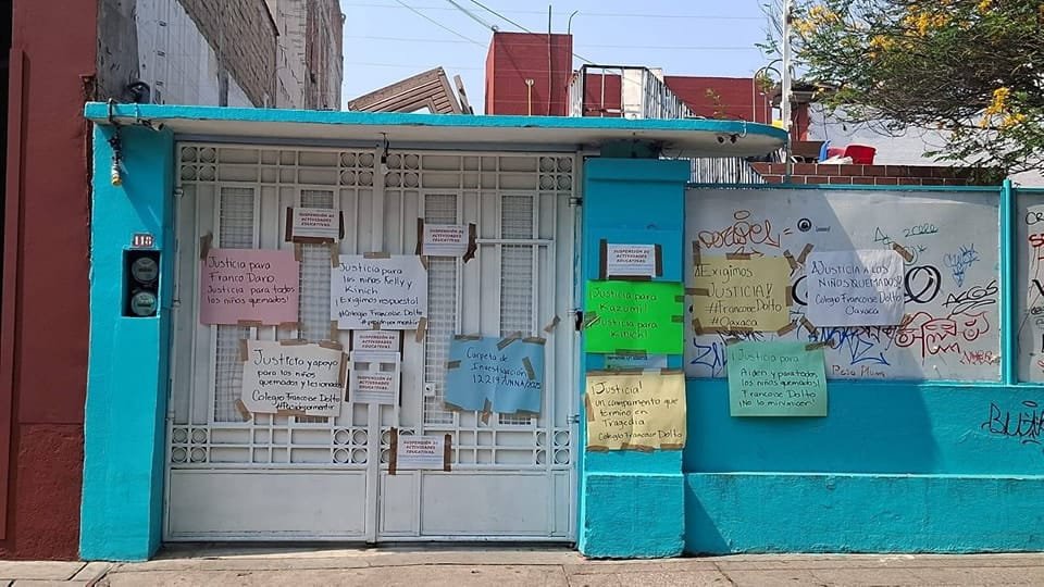 Los padres y madres de familia colocaron cartulinas en la escuela, la cual se mantiene cerrada, con la que exigen justicia para todos los menores quemados, y que permitió que este caso se diera a conocer.