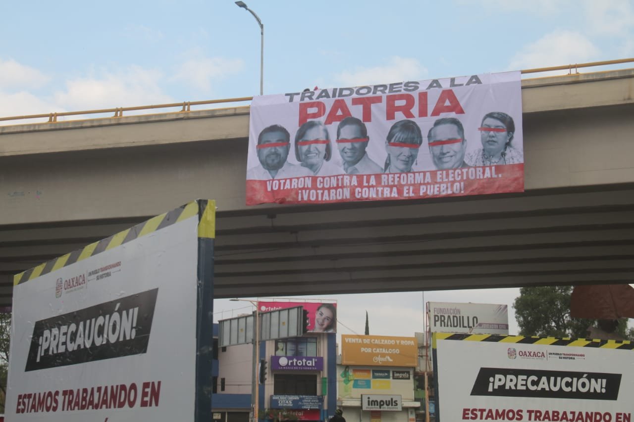 La ciudad de Oaxaca amaneció con lonas colgadas en al menos ocho puentes peatonales en las que se exhiben las fotos de los legisladores oaxaqueños federales que se abstuvieron o votaron en contra de la reforma electoral de la presidenta de la República, Claudia Sheinbaum Pardo.