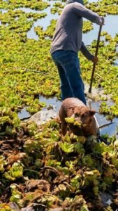 De acuerdo con los habitantes, Beni aprendió a retirar el lirio acuático o lechuguilla, como un acto de gratitud hacia Alfonso y Graciela, quienes la adoptaron cuando la perrita quedó huérfana y abandonada en la presa.