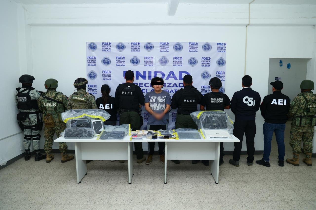 La Fiscalía de Oaxaca informó esta mañana que la localización, identificación y posterior detención de L.A.F.V., se logró mediante un operativo interinstitucional, en el que se aseguraron diversos dispositivos electrónicos utilizados para la producción y distribución de material ilícito.
